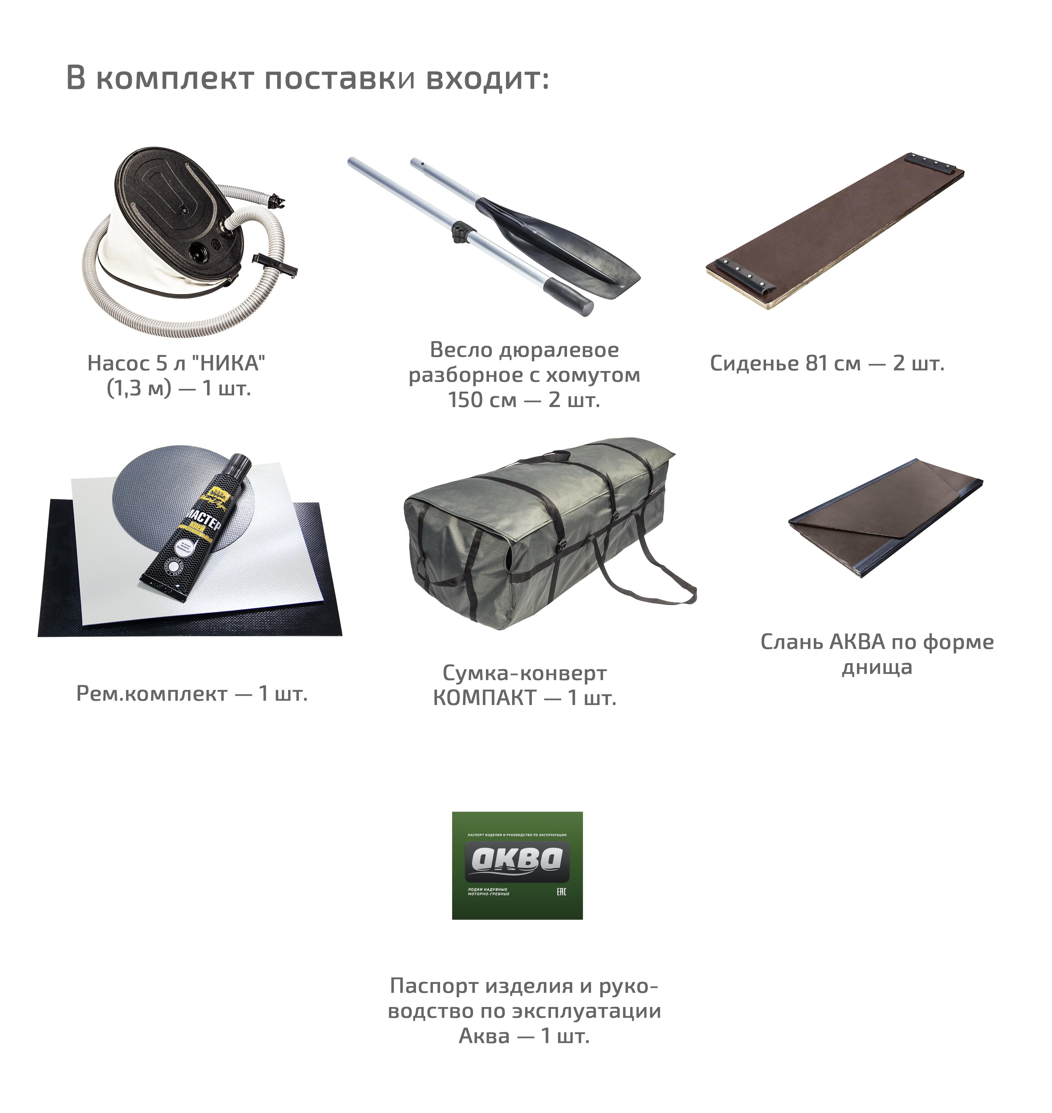 Аква 2900 СКК компактно упакована в одну сумку-конверт, что позволяет её без прроблем транспортировать и переносить. Модель оборудована надежными, стационарными клапанами, с полуоборотной кнопкой тарелочки, которые позволяют быстро сдуть лодку, а крышки являются надежной защитой от нежелательного стравливания воздуха. Аква 2900СКК оснащена уключинами для весел поворотного типа, а так же имеет леера безопасности по обеим бортам, удобные ручки для переноса (1 на носу, 2 на корме), надежные фиксаторы для весел. Модель комплектуется жесткой сланью-книжкой, которая изготавливается из ламинированной водостойкой фанеры. У нее надувной киль, придающий курсовую устойчивость. Слань обладает рабочей шершавой поверхностью, предотвращающей скольжение по ней ног.